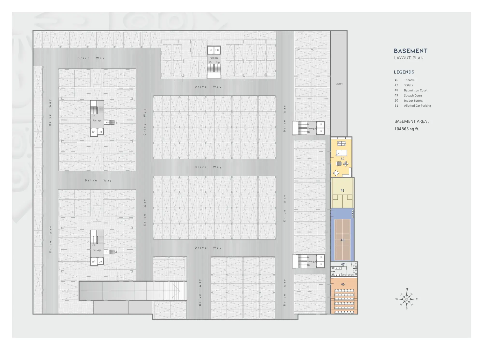 1 lac + sq.ft. basement car parking of 16 ft height. 448 car parking slots with additional provision of 300 hydraulic car parking slots.